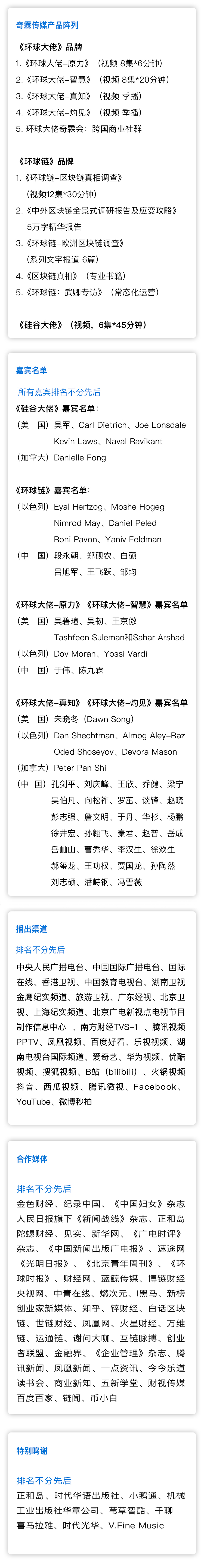 武卿:奇霖传媒创始人、CEO,大型跨国媒体品牌《硅谷大佬》《环球链》《环球大佬》总制片人、主持人,奇霖资本创办人,科技财经节目主持人。央视《焦点访谈》《新闻调查》前调查记者,多项知名国际、国家大奖获得者。正和岛媒体专家,2017“中国十大品牌女性”荣誉获得者。长于视频, 为该领域不可多得的模式研发、创作、运营皆强者。